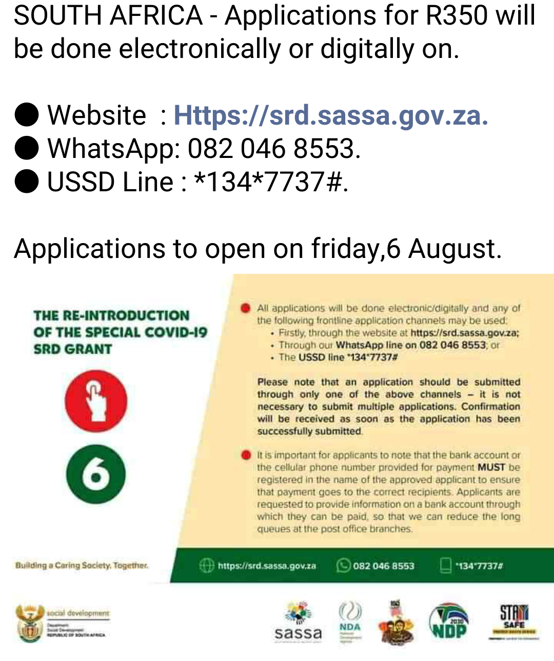 There are three options to apply: Details about the application process for the r350 grant will be released soon. Application systems will open on friday, 6 august 2021, from 9am. Make sure that you are ready before you start. Sassa srd r350 grant using whatsapp. How to apply for the r350 coronavirus relief grant. Everyone eligible — from 18 years to 59 years — must apply for this grant even if their application was successful last time. An application should be submitted through only one of the above channels. Sassa will only process one application received from each applicant. Not receiving any unemployment insurance benefit and does not qualify to receive unemployment insurance benefits; How to apply for srd r350. You may also like:here … Everyone eligible — from 18 years to 59 years — must apply for this grant even if their application was successful last time.